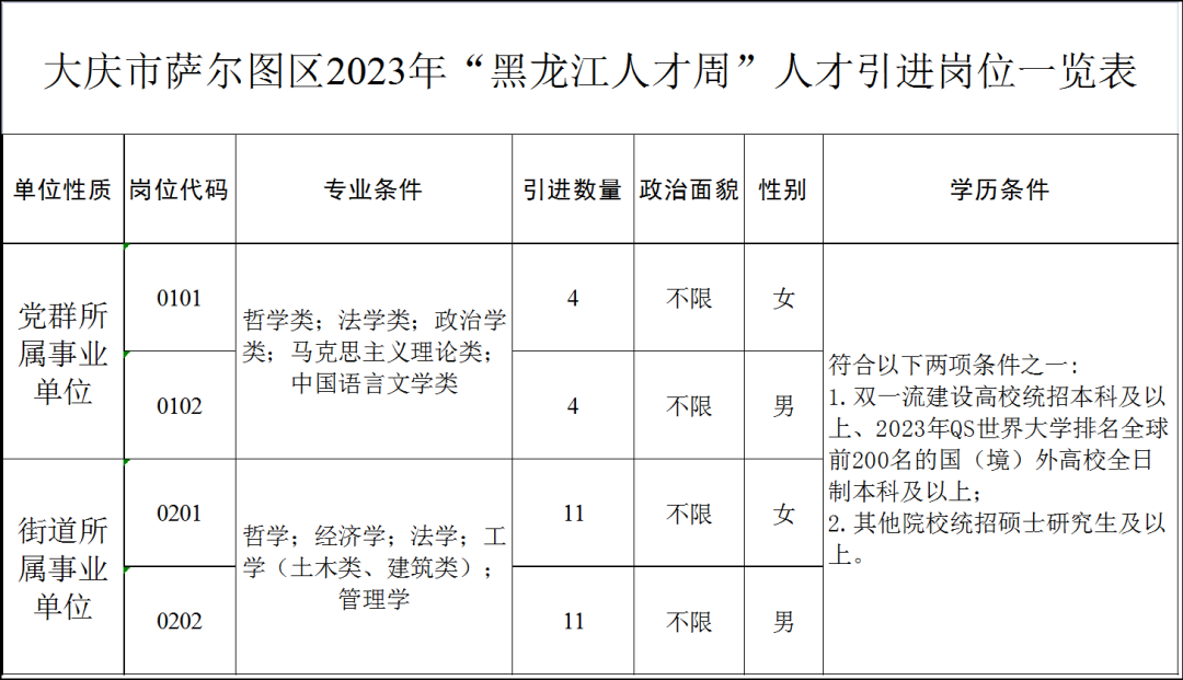 計劃引進黨群所屬事業單位工作人員8人,街道所屬事業單位工作人員22人,具體引進崗位、數量要求詳見《薩爾圖區2023年“黑龍江人才周”人才引進崗位一覽表》(見附件)。