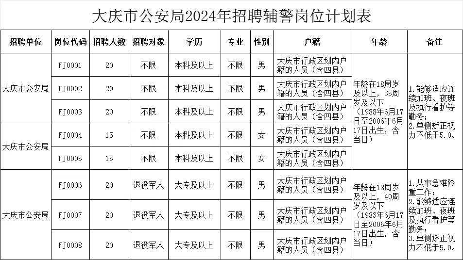 根據工作需要,大慶市公安局面向社會公開招聘警務輔助人員(以下簡稱“輔警”),現將有關事宜公告如下: