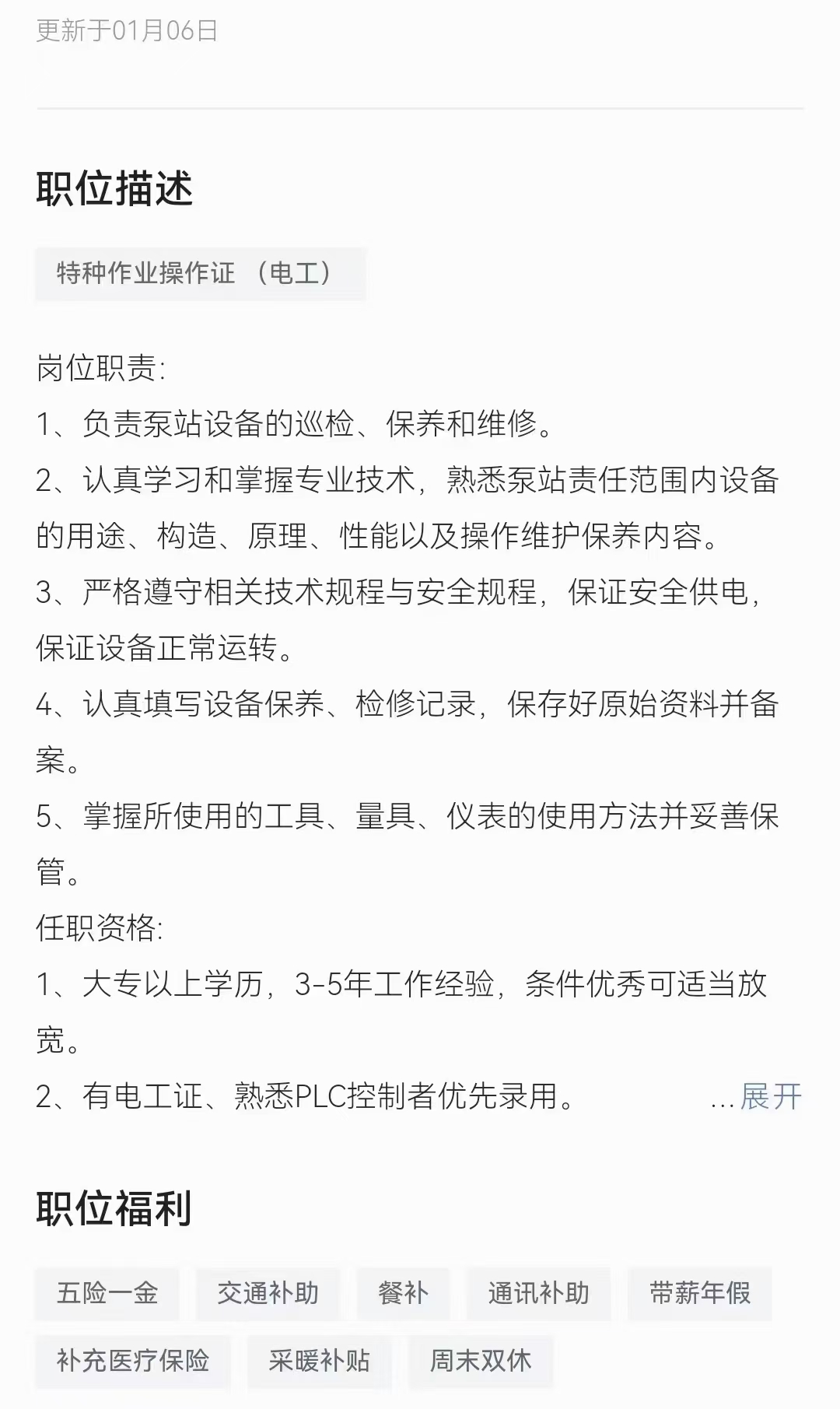 大慶國企直簽,大專以上學歷,有電工作業證者優先,年后面試,五險一金,薪資3500+交補,餐補,年薪等福利,工作地點讓區。
